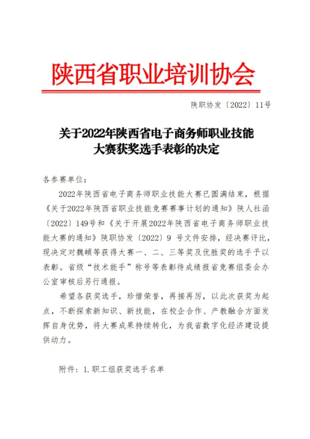 12月13日,由陕西省职业协会主办的2022年陕西省电子商务师职业技能大赛落下帷幕。大赛以线上参赛监赛与线下集中评审相结合的方式进行。经过6小时激烈角逐,我校6位参赛选手沉着应战、努力拼搏,在来自全省的上百名参赛选手中崭露头角,陈宇航、王静文、张子旭、李国嘉、刘旗荣获三等奖,田莉荣获优胜奖。