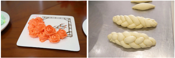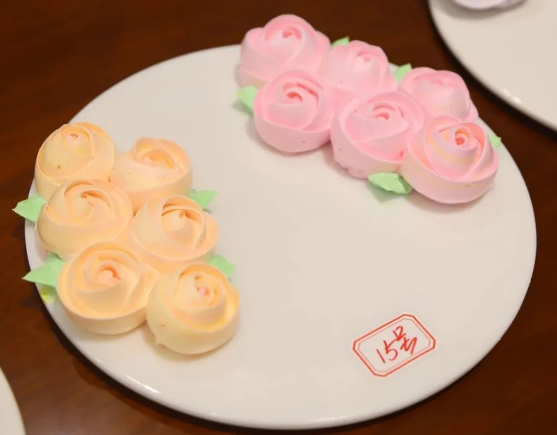 先让我们一起来回顾早上举办的第一轮西点基本功比赛,本次大赛内容为面包手法、基础裱花,比赛现场,西点学子们有条不紊的进行着裱花制作,独具匠心的裱花技术,赋予这些奶油花朵真实的生命,色彩缤纷绚烂,花朵形状和色泽都源自于自然,娇鲜欲滴,仿佛可以闻到花香。