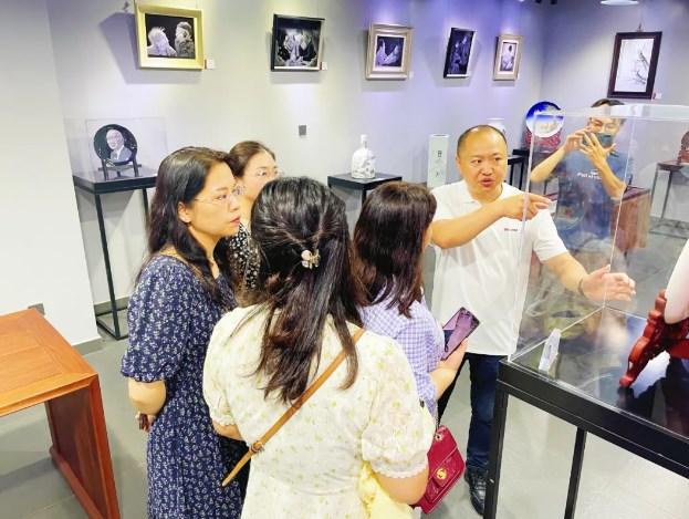 在大丰区恒北非遗集市,古色古香的长廊院落,繁华喧闹都市中的一方自然淳朴的非遗天地。“麦秆画是选用天然麦秆,经过熏蒸、漂白、剖杆、刮平、贴块、绘图、剪刻、熨烙、贴画、装裱等一系列复杂工序,制作出惟妙惟肖、栩栩如生的麦秆画艺术作品。”研学现场,省级非遗传承人吴永龙大师向前来学习的老师们展示了麦秆画制作技艺。在陈银付刻瓷艺术馆,大家见到了各种各样的刻瓷艺术作品,有写实的人物肖像,有写意的山水花鸟,更有充满浓郁地方风情的滩涂风光、麋鹿、勺嘴鹬等。在国家级非遗传承人、刻瓷艺术大师陈银付的生动地讲解下,老师们不仅了解到沧海桑田的盐垦文化,更深深体会到了糅合了温润委婉的里下河文化和粗犷奔放的海洋文化的大丰民风民俗。