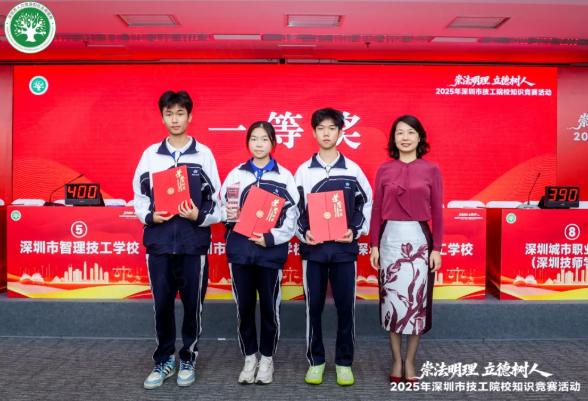 近日,由深圳市人力资源和社会保障局主办的2025年深圳市技工院校"崇法明理·立德树人"知识竞赛圆满落幕。经过多轮激烈的角逐,深圳市携创高级技工学校健康管理学院口腔医学技术专业王艺涵、吴南昌、李鑫泉三名学子组成的代表队,凭借扎实的法学功底、沉稳的临场发挥,以460分的优异成绩勇夺桂冠,充分展现了学校在法治教育与思想道德建设方面的扎实成果。