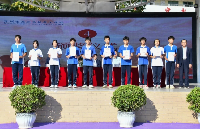 随后,孙盛宝宣读《2025级新生军训表彰决定》。授予葛欣然、肖博宣、郭霖熙、陈皓、黄子珊等200名同学“军训标兵”荣誉称号,授予陈琼、黎小花、邓海清、赖晓敏等10名教师“军训先进工作者”荣誉称号;授予机电工程学院、数字创意学院“军训优秀组织单位”荣誉称号。受表彰的个人和集体依次上台,从校领导手中接过凝聚着汗水与荣光的证书。这份表彰不仅是对个人努力的肯定,更是对深圳市携创高级技工学校"立德树人、技能报国"教育理念的生动诠释。