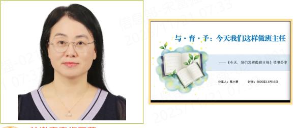 戴扬老师用《以爱为针 以行为线——中职服装班主任的育人修行》为题,介绍了她读完此书的感悟,收获的不仅是班级管理的方法与技巧,更是认识到班主任这一角色的责任与使命,她将用书中的理念做指导,努力成为学生心中的好老师、好伙伴。