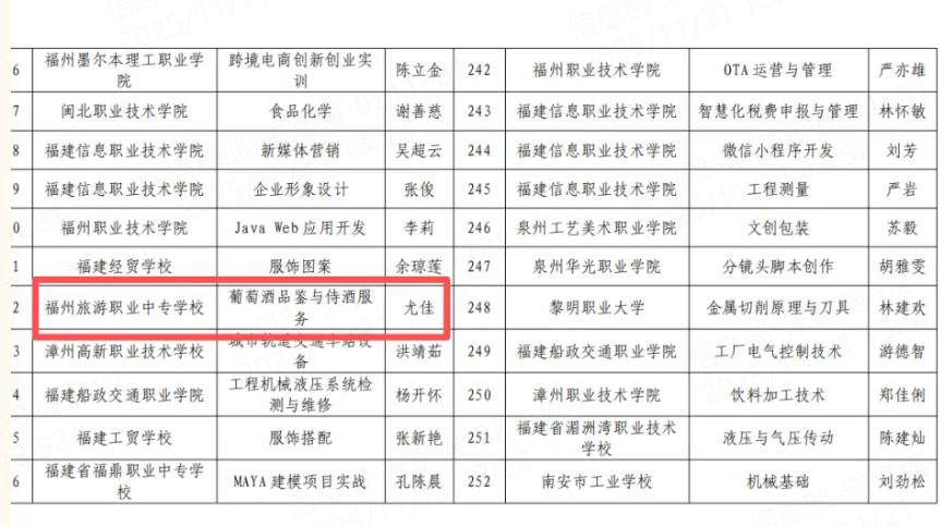 近日,福建省教育厅公示 2025 年省级职业教育重点项目拟认定名单,福州旅游职业中专学校凭借扎实的育人实践与特色建设,斩获三项省级认定!此次认定涵盖班主任工作室与专业课程两大核心领域,既是对我校教育教学质量的权威肯定,更是特色发展之路的重要突破:1 个省级名班主任工作室、1 门省级课程思政示范课程、1 门省级在线精品课程。