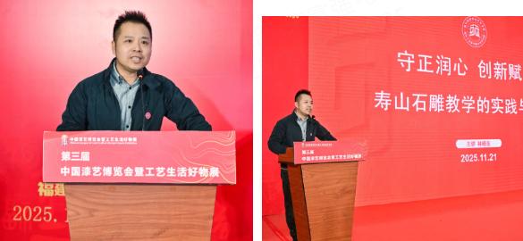 福州旅游职专招就处主任、省工艺美术大师林晓东老师的《守正润心 创新赋能——寿山石雕教学的实践与探索》主题,围绕学校在非遗传承与文旅产业发展中的关键作用展开分享。依托 “十四五” 期间国家、省、市各级政府的政策扶持,学校已成为非遗立法调研的重要教育阵地,见证并参与了软木画、脱胎漆器、寿山石雕三大传统技艺的分阶段立法保护进程。在传承实践中,学校注重非遗元素的生活化转化,推动脱胎漆器融入器皿、家具、茶具等生活场景,深挖寿山石雕的国石文化价值与历史底蕴;教学中创新融入思政元素,通过党徽、国旗等主题创作传承匠心,同时,积极探索AI与3D 技术的融合应用实践。目前,学校正推进工艺美术楼建设,未来将持续以教育为纽带,助力非遗技艺在保护中创新、在传承中发展。