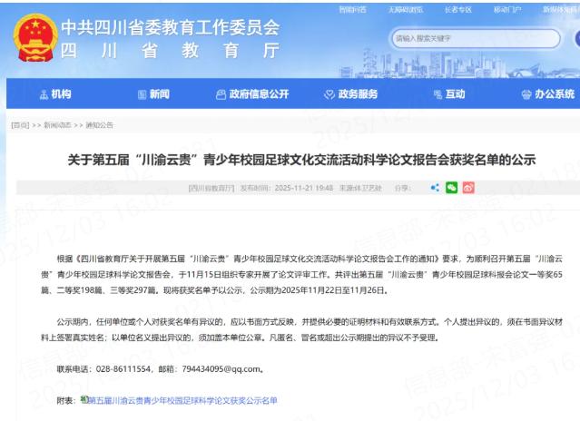 近日,在四川省教育厅、重庆市教育委员会、云南省教育厅、贵州省教育厅共同组织的第五届“川渝云贵”青少年校园足球文化交流活动科学论文报告会中,攀枝花市建筑工程学校、攀枝花市花城综合高级中学校郭金龙、唐建菊、陈玥汐、毛岸辉、杨玉友组成的体育教研团队凭借扎实的研究功底与创新的研究视角脱颖而出,其提交的论文成功斩获一等奖。此次评选竞争异常激烈,活动共征集到来自全国22个省市共1495篇参赛论文,汇聚了各地校园足球及学校体育领域的众多研究成果。共评出第五届“川渝云贵”青少年校园足球科报会论文一等奖65篇、二等奖198篇、三等奖297篇。