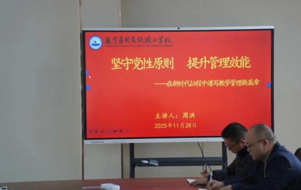 为深入贯彻落实党的二十届四中全会精神,引领全体党员准确把握会议核心要义,切实将思想和行动统一到党中央决策部署上来,推进党建工作和业务工作深度融合,形成思政课程和课程思政同向同行的育人模式,2025年11月28日下午,周洪同志以“坚守党性原则,提高管理效能”为题为全体党员教师讲授专题党课。