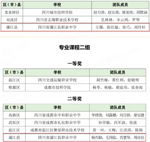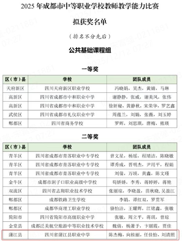 近日,成都市教育科学研究院综合处公布了2025年成都市中等职业学校教师教学能力比赛拟获奖名单。四川省蒲江县职业中学在此次赛事中表现卓越,一举斩获3个二等奖。