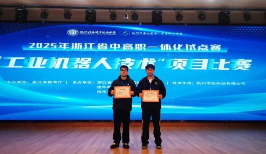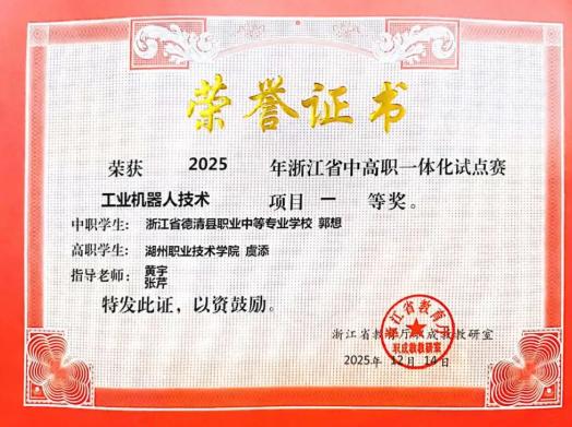 12月12日至14日,2025年浙江省中高职一体化试点赛“工业机器人技术”项目在杭州市萧山区第一中等职业学校举行,德清职业中专与湖州职业技术学院组成的学生团队荣获一等奖。团队由23机器人3+2班郭想和湖州职业技术学院虞添两位学生组成,我校黄宇老师和湖职院张芹老师担任指导教师。