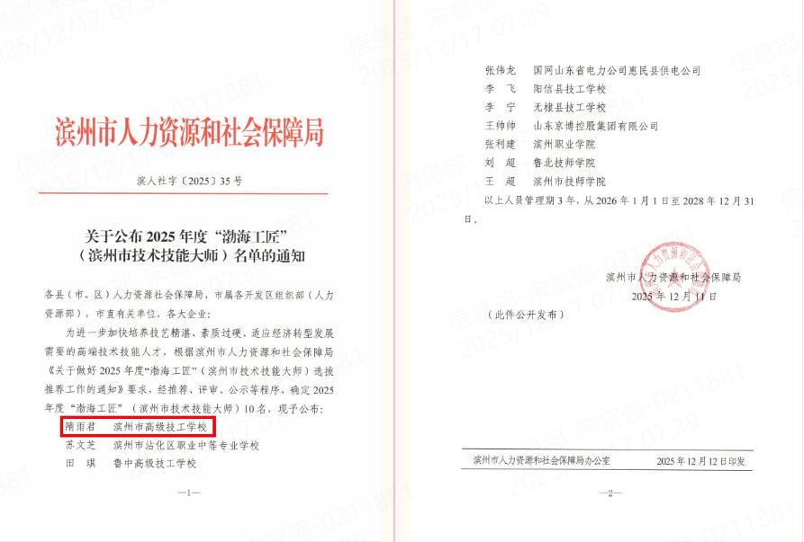近日,滨州市人力资源和社会保障局印发《关于公布2025年度“渤海工匠”(滨州市技术技能大师)名单的通知》(滨人社字〔2025〕35号),滨州市高级技工学校教师隋雨君荣获2025年度“渤海工匠(滨州市技术技能大师)”称号。