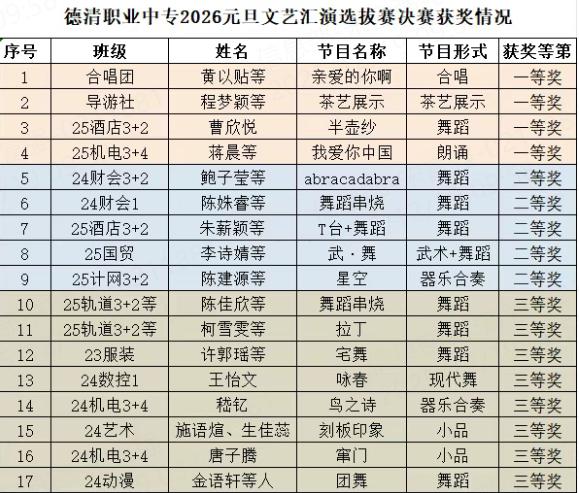 艺术的熏陶润物无声,青春的步伐永不停歇。此次元旦文艺选拔与十佳歌手大赛的华彩乐章虽已落幕,但德清职业中专学子追求卓越、热爱生活、向往美好的心永远跃动。让我们期待他们在更大的舞台上继续闪耀,也共同展望2026年更加精彩的校园文化生活!