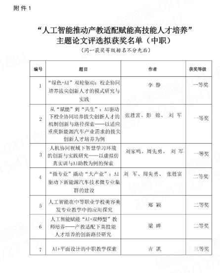 近日,重庆市教育科学研究院公示了“人工智能推动产教适配赋能高技能人才培养”主题论文及典型案例评选结果,我校获一等奖 3个、二等奖 3 个、三等奖 3个 。