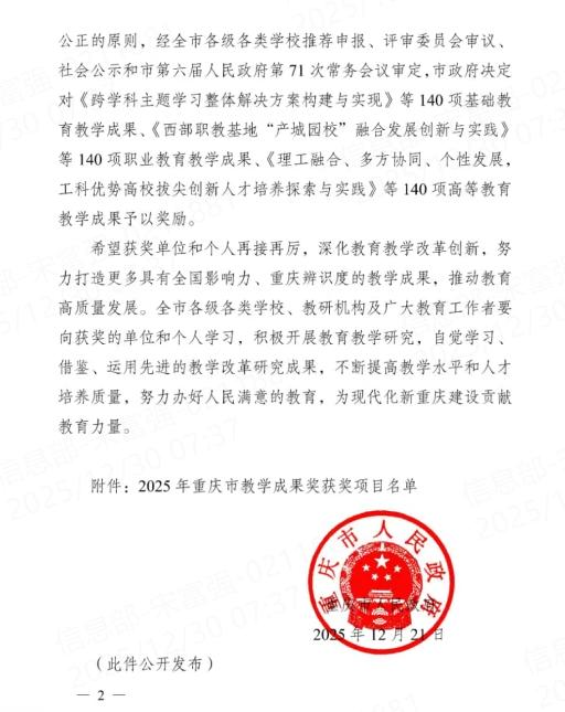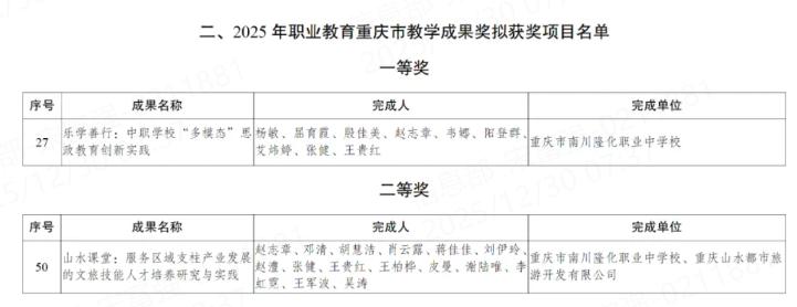 近日,重庆市人民政府发布《重庆市人民政府关于2025年重庆市教学成果奖励的决定》,我校组织申报的《乐学善行:中职学校“多模态”思政教育创新实践》获职业教育类一等奖,《山水课堂:服务区域支柱产业发展的文旅技能人才培养研究与实践》获职业教育类二等奖。
