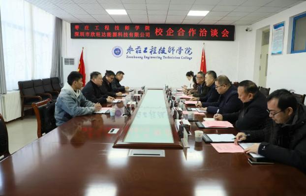 12 月 26 日上午,深圳市欣旺达能源科技有限公司人力资源总监林超一行来校就校企合作事宜进行洽谈。枣庄工程技师学院党委书记沈继章,党委副书记、院长陈克坦,党委委员、副院长续继营,党委委员、副院长甘信峰出席会议。