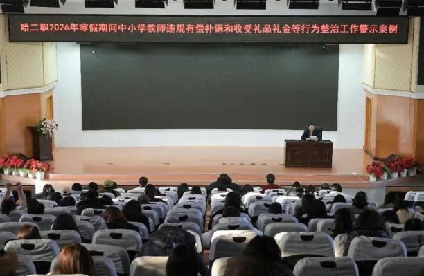 为深入落实“双减”政策要求,筑牢师德师风建设防线,确保全体学生度过健康有序的假期,1月9日上午,哈尔滨市第二职业中学校组织召开了2026年寒假期间中小学教师违规有偿补课和收受礼品礼金等行为整治工作警示会议,全体教职工参会。