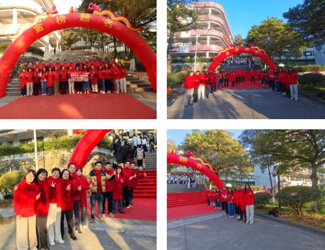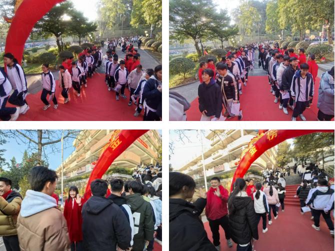 2026年1 月 10 日清晨,“金榜题名门”前旌旗招展,校领导与全体带考教师列队而立,身着红色服装,神情殷切而坚定。学子们身着整齐校服,昂首挺胸,迈着铿锵步伐逐一穿过 “金榜题名门”。