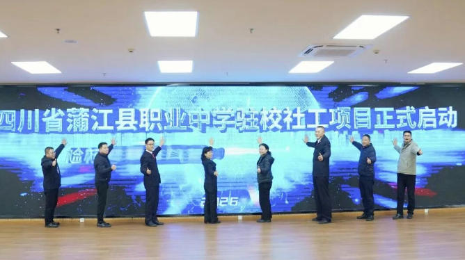 致辞环节结束后,与会领导共同启动仪式装置,标志着蒲江职中驻校社工项目正式落地实施。