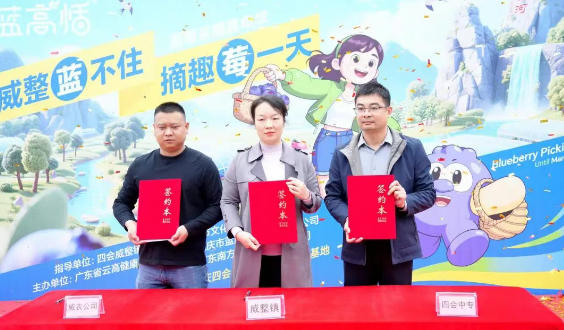 1月17日上午,由广东省云高健康科技有限公司、南方报业南方优品联合主办的蓝莓采摘嘉年华在威整镇蓝威农业蓝莓基地盛大开幕。广东省肇庆市四会中等专业学校作为重要参与单位,在活动中隆重发布“青禾助农”品牌,并顺利举行“青禾助农”直播实训基地揭牌仪式。同时,学校与威整镇人民政府、四会市威农农业发展有限公司成功签署战略合作协议。此项目的顺利实施,得益于驻威整镇帮镇扶村工作队的积极推动与协同联动,标志着校政企协同助力乡村振兴迈入新阶段。