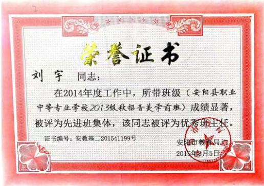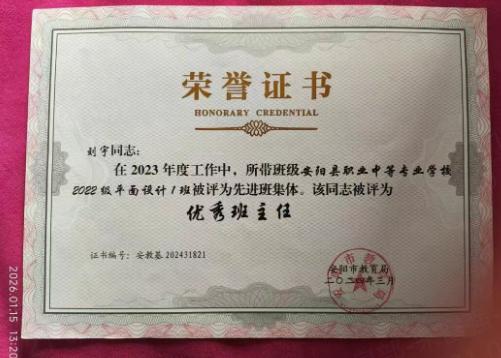 从教多年来,刘宇始终坚持以教带研、以研促教,持续精进专业能力与教学水平。在教学实践中,他积极投身各类教学竞赛与教研活动,斩获累累硕果:2023年获评安阳市文明教师;2015年、2023年两度获评师德先进个人;2015年、2023年两度获评县级优秀教师;2013年荣获县级青年教师标兵称号;2023年荣获县级教学标兵称号;2017年荣获德育标兵称号;2014年、2024年两度荣获市级优秀班主任称号;2014年斩获县级优质课一等奖、市级优质课二等奖;2025年荣获河南省职业教育教学能力大赛三等奖。此外,他还多次辅导学生参加省级、市级技能大赛和文明风采大赛,助力学生屡获省、市一等奖的佳绩。