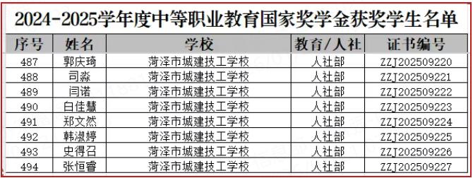 近日,教育部、人力资源社会保障部发布关于2024-2025学年度中等职业教育国家奖学金获奖学生名单的公告,菏泽市城建技工学校8名优秀学子凭借扎实的专业功底、突出的技能素养及不懈的进取精神,成功斩获该奖项,每人将获6000元奖励,以实力为青春镌刻荣光。