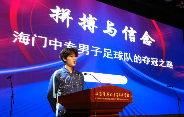 学生代表、22TD04班屠后记同学以《我们,是冠军!》为题,深情讲述了校男子足球队勇夺“省长杯”冠军的奋斗历程。从训练初期的迷茫到赛场上的默契,从落后时的坚守到夺冠时的热泪。“冠军不是天生的,是练出来的,是磨出来的!”这份在汗水中淬炼、在团队中成长的经历,不仅铸就了绿茵场的辉煌,更成为激励全场学子的人生信条。