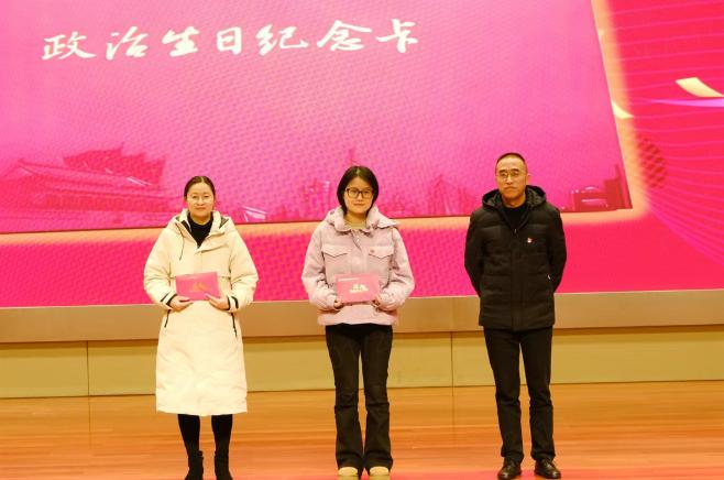活动中,学校为1月过政治生日的黄娟、李媛两位同志举行了庄重的政治生日仪式。电信财贸综合党支部书记袁兵为两位同志颁发了政治生日贺卡。随后,由黄娟同志领誓,全体党员高举右拳,面向鲜红党旗重温入党誓词,铿锵有力的誓言回荡在会场,再次唤醒了每一位党员的入党初心与使命担当,进一步坚定了永葆党员本色、勇担职业教育使命的信念。
