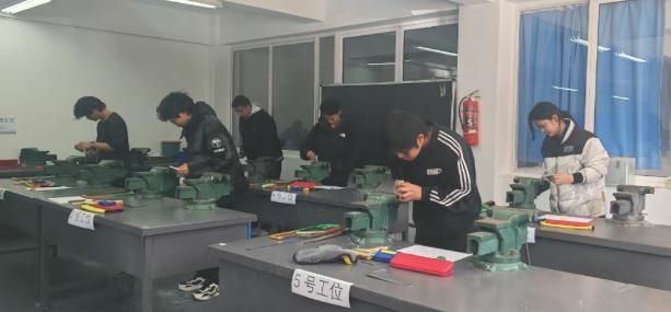 机械专业学子在金工实训精准操作,以锯弓为笔,以锉刀为锋,在钢屑飞舞间打磨零件的精度。