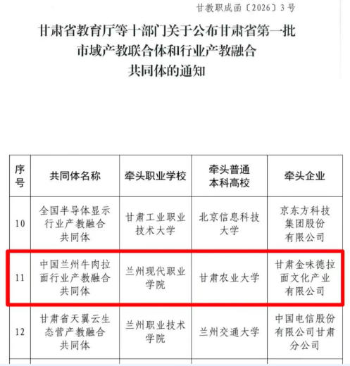 近日,甘肃省教育厅等十部门联合发布《甘肃省第一批市域产教联合体和行业产教融合共同体名单》,兰州现代职业学院与甘肃农业大学、甘肃金味德拉面文化产业集团有限公司牵头申报的“中国兰州牛肉拉面行业产教融合共同体”成功入选。