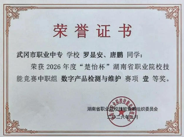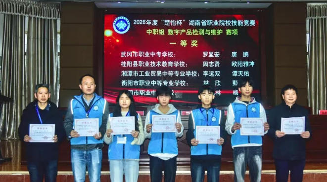 2月6日,在刚刚闭幕的2026年度“楚怡杯”湖南省职业院校技能竞赛中职组数字产品检测与维护、电梯保养与维修赛项中,武冈市职业中专学校参赛选手罗显安、唐鹏、杨薇、伍嘉林、韦容靖、张忠宝六位同学从来自全省的54支队伍中脱颖而出,获得三个省一等奖。经过两天激烈角逐,数字产品检测与维护赛项共有45支参赛队,评选出一等奖5个、二等奖9个、三等奖14个;电梯保养与维修赛项9支参赛队参赛,评选出一等奖1个、二等奖2个、三等奖3个。比赛中,参赛选手充分展示了扎实的专业技能、良好的职业素养和积极的拼搏精神,有效检验了湖南省职业院校相关专业的教育教学成果,弘扬了“劳动光荣、技能宝贵、创造伟大”的时代风尚。