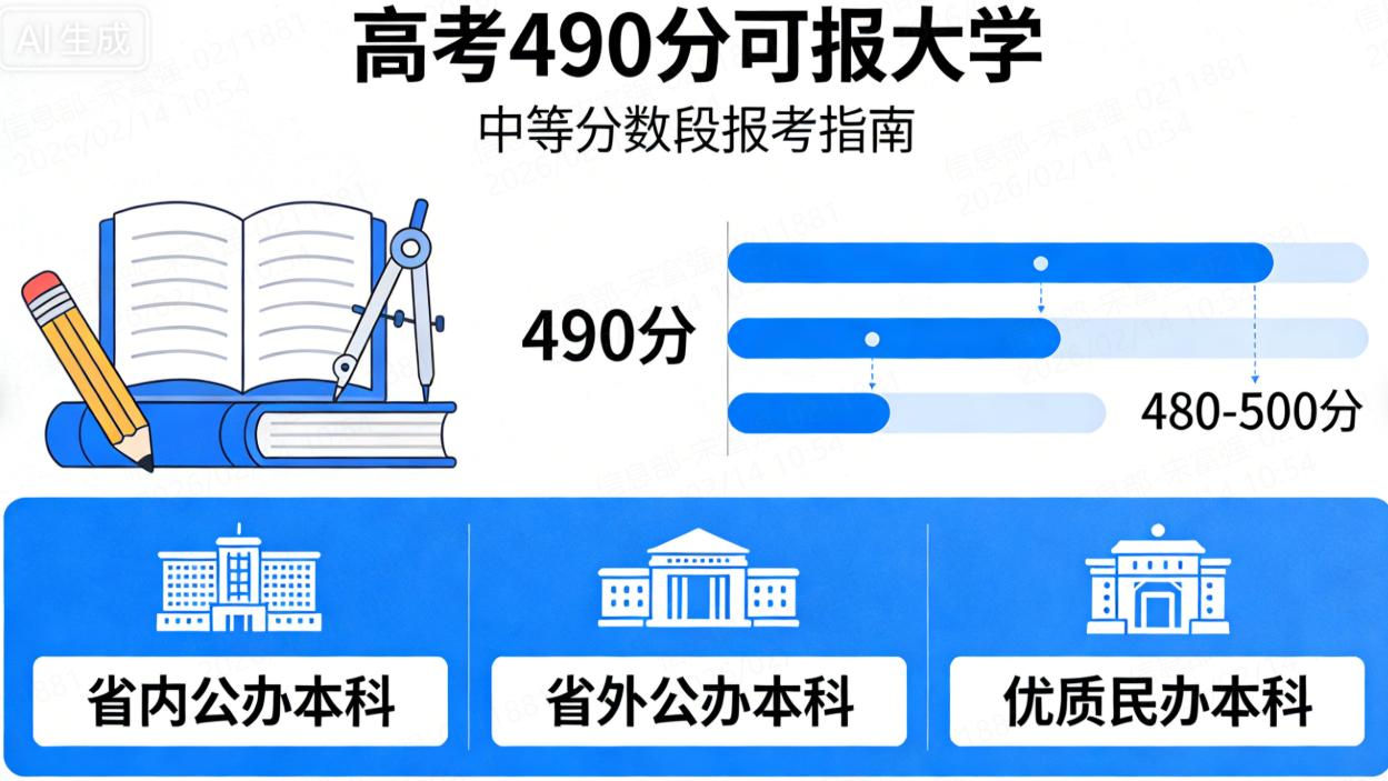 高考490分(物理类)可上公办二本,部分省份能冲公办一本。可冲刺成都理工大学 (宜宾校区)、齐鲁工业大学、重庆科技大学等优质公办本科,稳妥报考湖北理工学院、临沂大学、赣南师范大学等省属本科,保底民办本科。专业覆盖计算机、电气、机械、师范、土木等实用方向,部分院校有特色王牌专业。