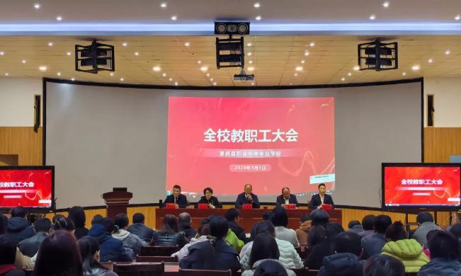 2026年3月3日,遂昌职业中专2026年春季开学工作会议在学校导游实训室召开。会议围绕“学思想、听汇报、谋部署”三个环节展开,全面部署新学期各项工作。学校领导班子及全体教职工参加会议。