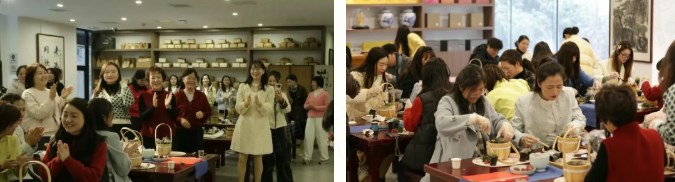点茶实操环节,两人一组,温盏、调膏、击拂……亲手点就一盏沫饽细腻的茶汤。多肉花艺,指尖生花,或包一束浪漫,或植一盆治愈。