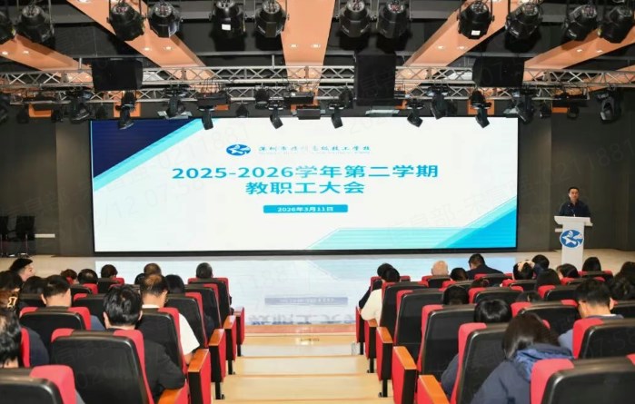 3月11日,深圳市携创高级技工学校2025-2026学年第二学期全体教职工大会隆重召开。会议全面部署新学期各项重点工作,动员全校教职员工统一思想、凝聚共识,以奋进姿态开创学校高质量发展新局面。大会由校长助理陈浩主持,学校党政领导班子及全体教职工出席。