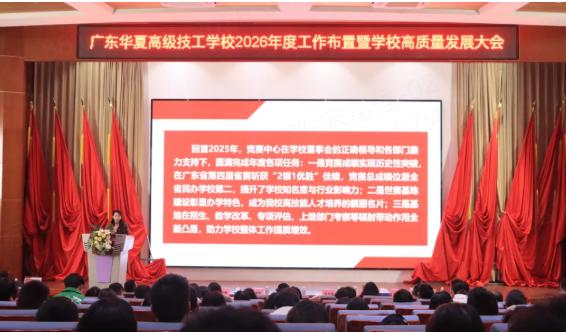 3月11日下午,广东华夏高级技工学校在实训2栋203多功能报告厅举行2026年度工作布置暨学校高质量发展大会。会议深入学习贯彻全省高质量发展大会精神,紧紧围绕“十五五”开局起步的关键节点,为学校新一年高质量发展定方向、明路径、聚人心。