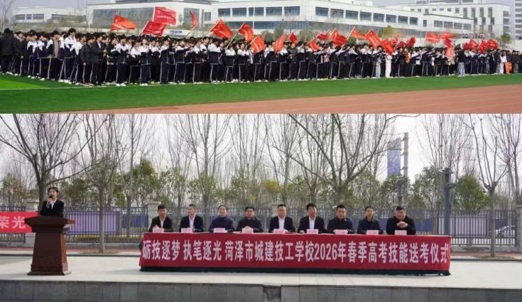 3月13日,菏泽市城建技工学校举行“砺技逐梦 执笔逐光”主题春季高考技能考试送考仪式。菏泽城建教育发展有限公司董事长朱子林,教育公司副总经理、菏泽市城建技工学校校长张远善及技工学校领导班子成员、高三全体师生参加仪式,为即将奔赴考场的高三学生壮行助威。