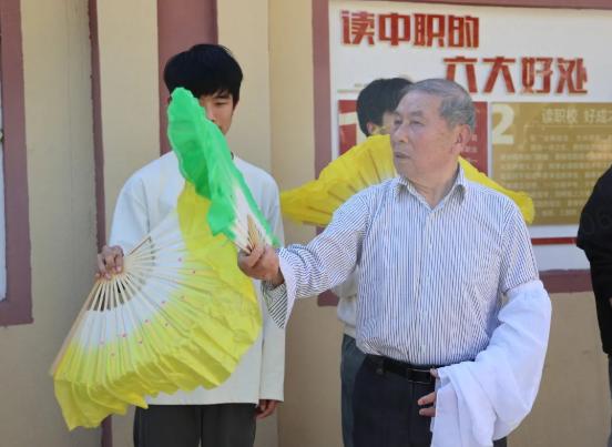 传承人指导安远中专学子们采茶戏元素单扇组合、绕花、矮子步、扇子花等。在场学生认真聆听唱戏要领和模仿动作,场面热烈,真切感受本土非物质文化遗产的魅力。