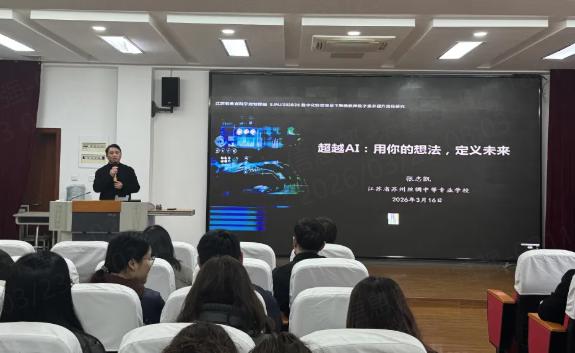 苏州丝绸中等专业学校的张志凯副书记带来《超越AI:用你的想法,定义未来》专题讲座。他结合人工智能时代的教育变革趋势,深入探讨了教师如何在AI技术冲击下,坚守教育初心,以独特的教学理念与创意设计打造有温度、有深度的课堂。讲座既有前沿理论的高度,又有教学实践的落地指导,引发了在场教师的深刻思考。