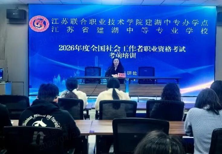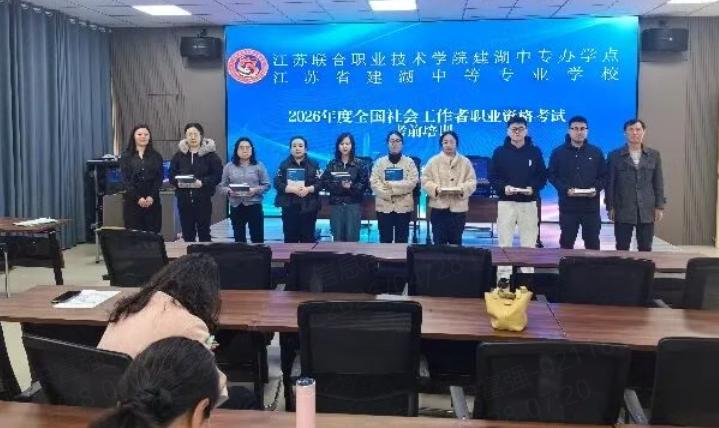 为扎实推进2026年社会工作者职业资格考试备考工作,助力参训教师高效备考、稳步通关,近日,建湖中专举行2026年社工考试培训暨授书仪式。学校校长夏正红出席活动,为参训教师授书,袁寿娟老师现场作考证经验分享与考前专项培训,全体参考教师参加本次活动。
