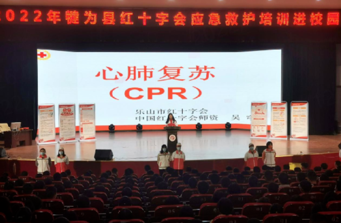 近年来,生命意外事件时有发生。厉兵秣马,未雨绸缪。为增强学生应对突发意外事件的救护能力和水平,不断提高应急救护知识普及面,10月9日下午,犍为职中积极配合红十字救护培训“五进”行动,迎来了犍为县红十字会在四川省犍为职业高级中学演艺大厅开展2022年应急救护普及培训。