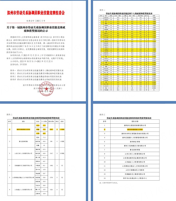 近日,第一届滨州市劳动关系协调员职业技能竞赛成绩公布,滨州市高级技工学校共24人参加比赛,15人获奖。其中升学部教师马力、常晓获得一等奖;智能制造教学中心教师王菲,升学部教师姜新乐、佟春月、吕文琪、王嘉怡、刘通通,经贸管理教学中心教师于院芳分别获得二等奖;升学部教师李莹、尹丽、王新新、刘月影、王君、张云清分别获得三等奖。同时,学校获得团体一等奖,并被评为优秀组织单位。