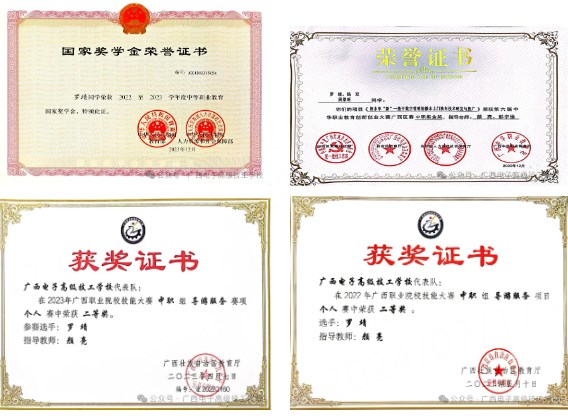 罗靖在校学习期间,始终保持着积极进取的精神。她勤奋努力、刻苦钻研,成绩优异,先后获得了2022年至2023学年度中等职业教育国家奖学金、2022年度自治区人民政府中等职业教育奖学金、2023年度校级奖学金二等奖及企业教育奖学金等奖励。