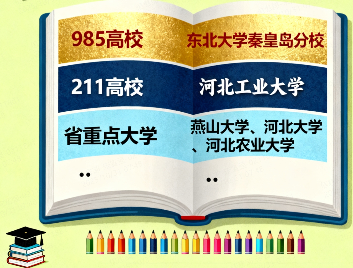 华北电力大学(保定校区)和东北大学秦皇岛分校虽在河北省招生且录取分数较高,但均为部属高校(华北电力大学属教育部,东北大学属工信部),不纳入河北省属 211 统计。