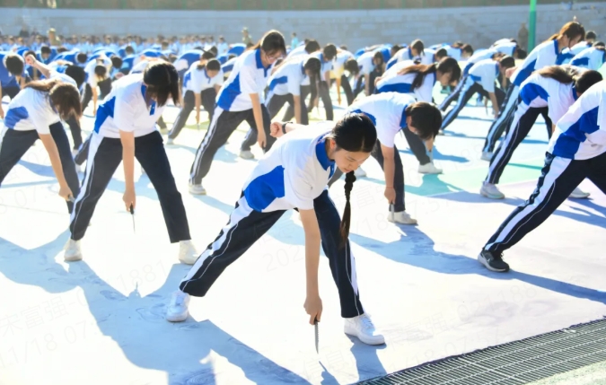 最令人耳目一新的是匕首操表演。阳光下,匕首寒光闪闪,同学们动作整齐划一,劈、刺、格、挡,每一个招式都充满力量与美感。他们矫健的身姿、凌厉的眼神,完美诠释了"技能报国"的豪情,成为秋日操场上一道亮丽的风景线。