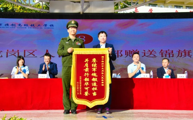 阎复名中校在讲话中高度肯定了学校的国防教育工作。他指出,在七日军训中,同学们用整齐划一的队列动作展现了新时代青年"请党放心、强国有我"的信念,这种迷彩青春与技能梦想的交融,正是龙岗区军民融合教育的创新实践。随着伊俊宏代表学校向人武部赠送锦旗,运动场上再次响起热烈掌声,这面锦旗承载着校方对承训单位辛勤付出的诚挚谢意。