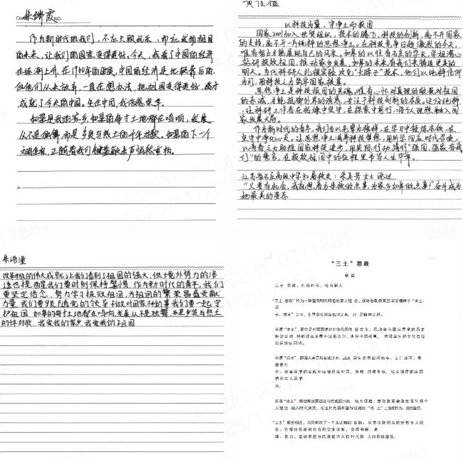 班会后,同学们认真撰写听后感,用文字记录所思所感。一字一句,是心灵的触动,是责任的觉醒,更是行动的起点。大家一致认为,此次“三土思政”班会不仅是一堂深刻的思想教育课,更是一次精神的洗礼与成长的激励。