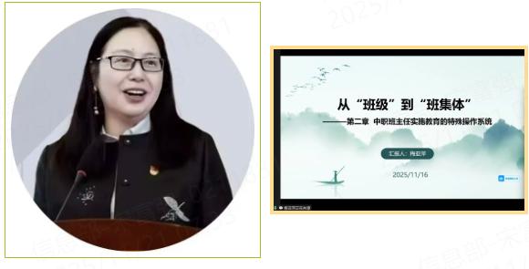 中国企业管理无锡培训中心主任、党委书记梅亚萍用《从”班级“到”班集体“》为题,阐述了书中第二章从“管”到“育”的目标导向;从”管“到”建“的职责导向;从”管“到”成“的结果导向,让大家对中职班主任实施教育的特殊操作系统更具深度和温度。