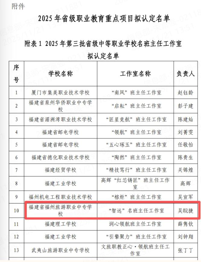 近日,福建省教育厅公示 2025 年省级职业教育重点项目拟认定名单,福州旅游职业中专学校凭借扎实的育人实践与特色建设,斩获三项省级认定!此次认定涵盖班主任工作室与专业课程两大核心领域,既是对我校教育教学质量的权威肯定,更是特色发展之路的重要突破:1 个省级名班主任工作室、1 门省级课程思政示范课程、1 门省级在线精品课程。