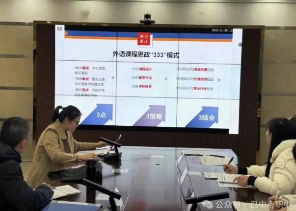 教学观摩环节,巴中职中罗芹老师以扎实专业素养与独特教学风格呈现了一节优质英语示范课,听课结束,老师们围绕教学设计、课堂互动与思政融合展开深入交流,在思维碰撞中共同探寻优化教学的新路径。