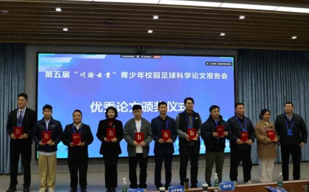 第五届“川渝云贵”青少年校园足球文化交流活动由川渝云贵四省(市)教育厅主管部门主办、成都体育学院承办,活动包含足球比赛、科学论文评选及研讨报告会等环节,旨在搭建区域校园体育交流平台,深化四省(市)校园足球发展共识。其中科学论文评选和研讨报告会环节,由业内专家组成评审组严格把关,从研究创新性、实践指导性等多维度进行综合考评,获奖成果更是被视作区域足球高质量发展的重要参考。会上,郭金龙老师作为获奖论文第一作者作专题报告,阐述论文研究主要成果并进行答辩。