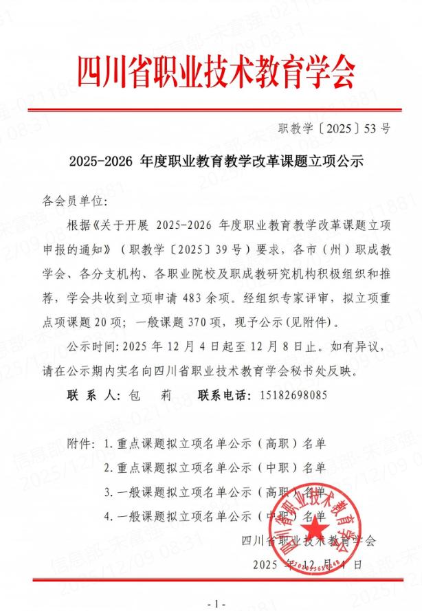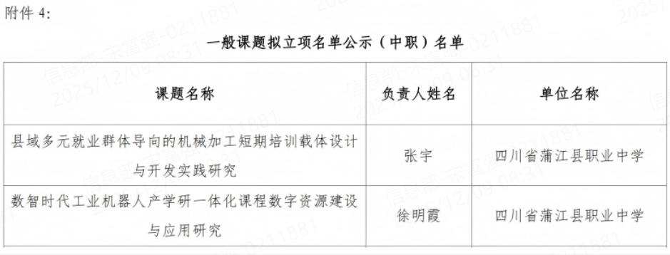 近日,四川省职业技术教育学会公布2025—2026 年度职业教育教学改革课题立项名单,蒲江职中申报的“县域多元就业群体导向的机械加工短期培训载体设计与开发实践研究”“数智时代工业机器人产学研一体化课程数字资源建设与应用研究”两项课题成功获批中职类一般课题!