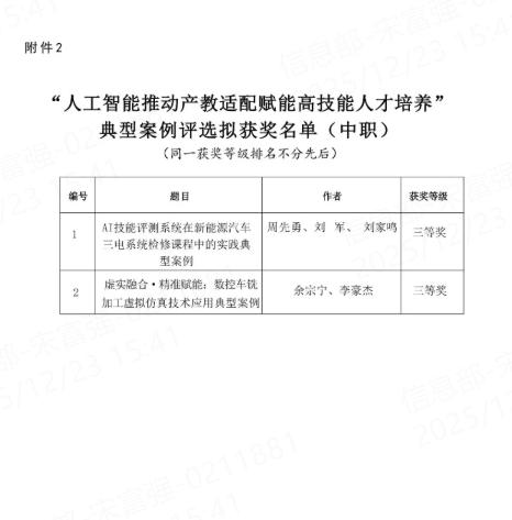 此次参评作品紧扣职教改革前沿,深度融合人工智能技术与专业教学实践,系统展现了我校在产教协同、数智化人才培养等方面的探索成果。获奖既是对我校教研水平的肯定,也是深化内涵建设的重要动力。